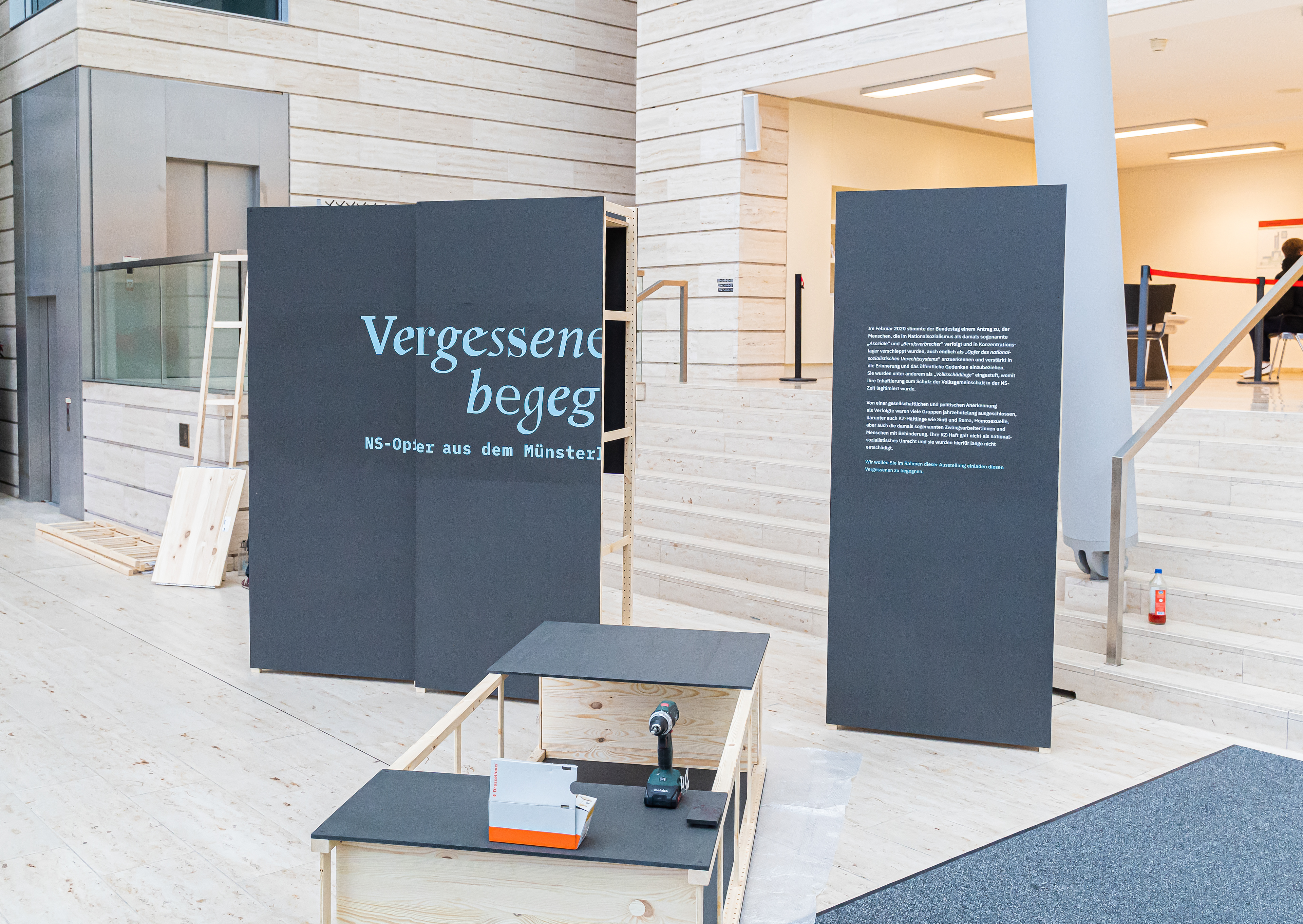 Für die Bezirksregierung Münster wurde die Ausstellung ursprünglich entworfen. Über zwei Eiträume wurde hier "Vergessenen begegnen" bisher einmalig in voller Größe aufgebaut und wurde damit die größte Ausstellung, die jemals. in der Bezirksregierung Münster stattfand.
